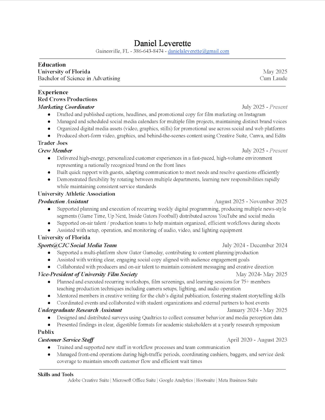 During my time at the University of Florida, I studied Advertising, where I refined that passion by exploring the relationship between content and audience—learning how storytelling shapes perception, builds connection, and drives engagement. My work has focused on translating ideas into compelling narratives that resonate across digital platforms.
